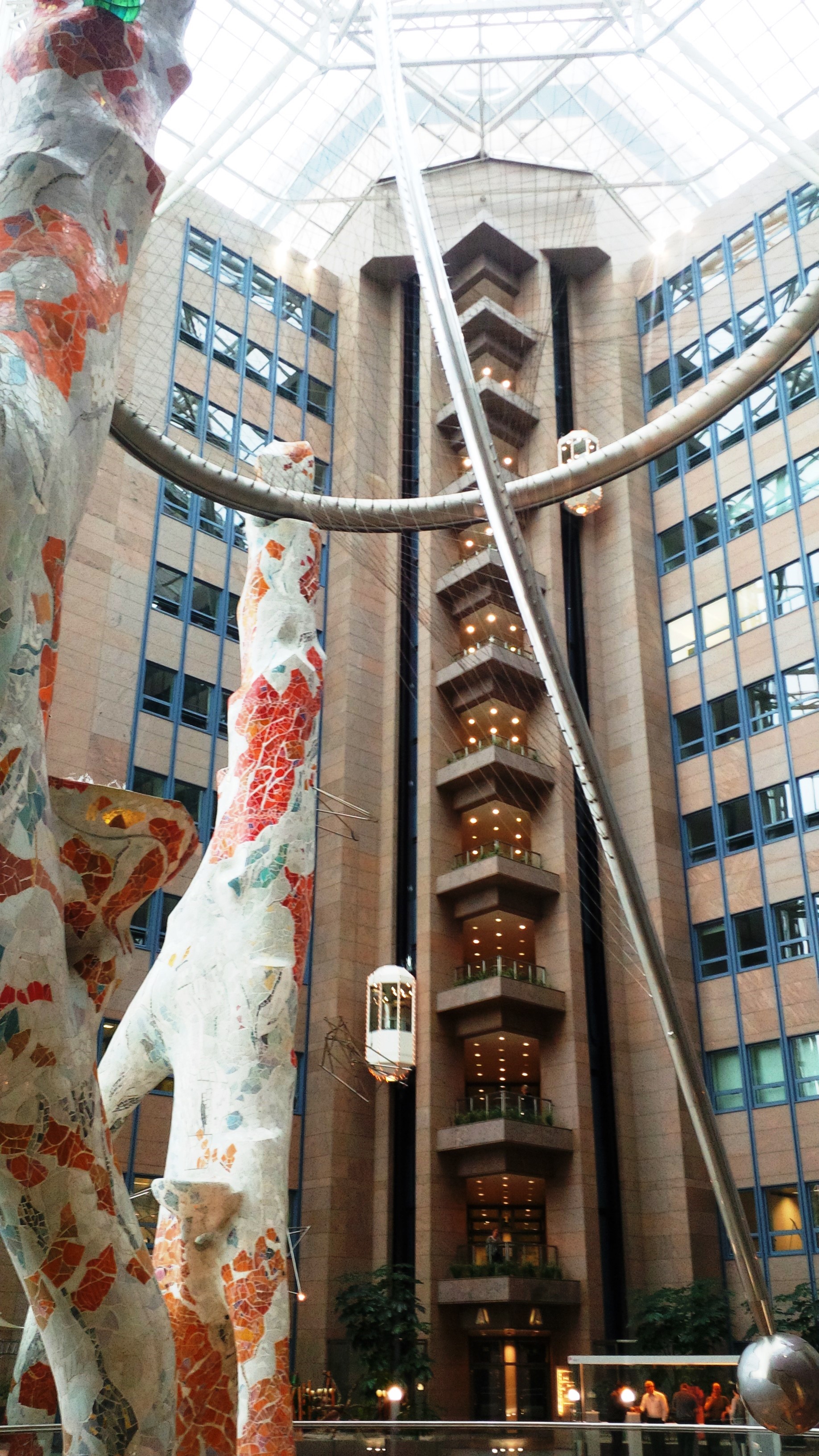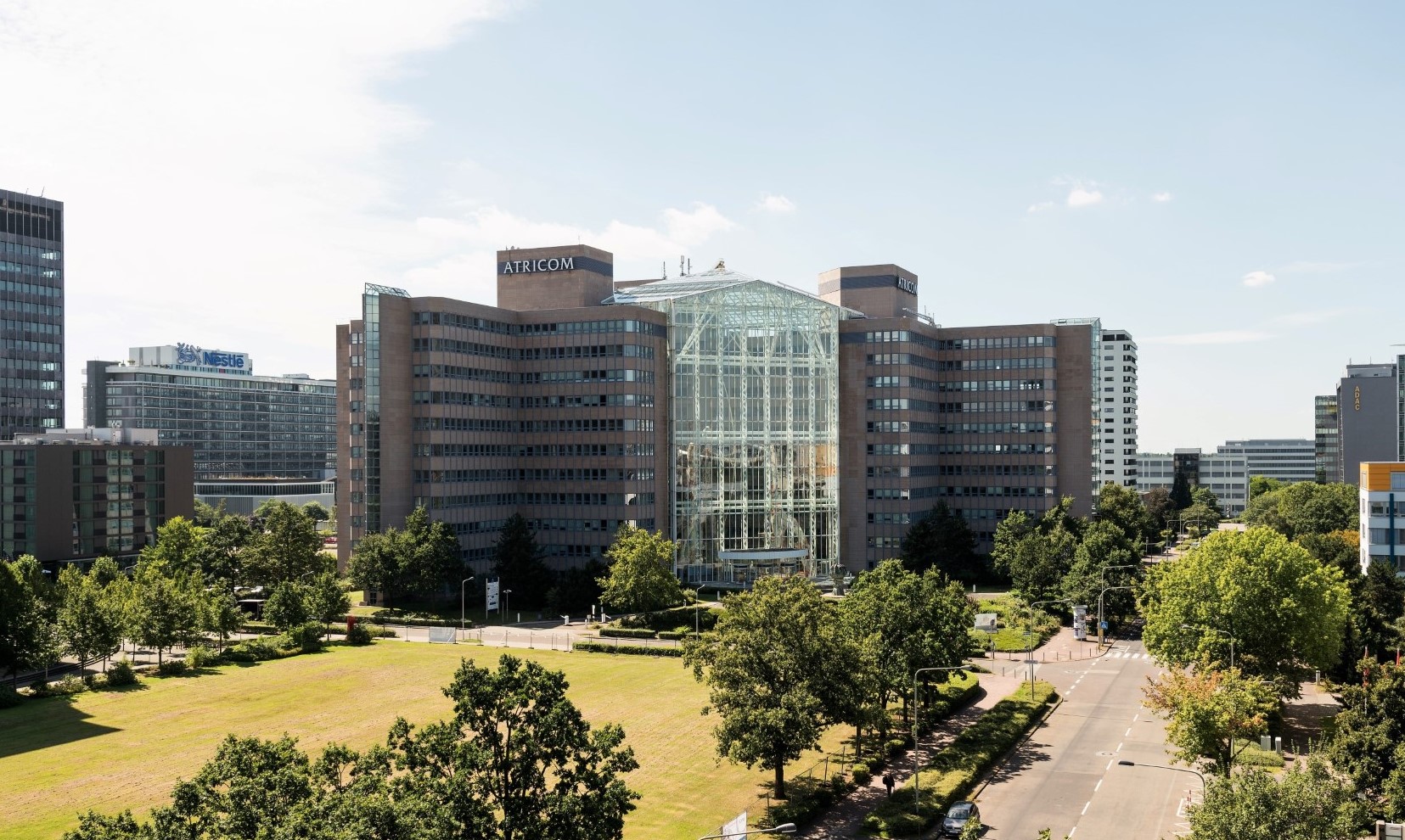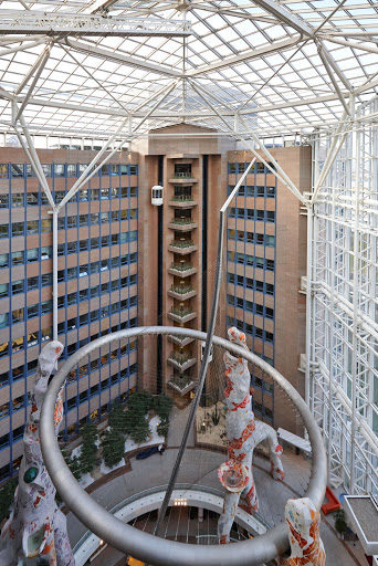The Atricom building was officially opened in 1990 in Frankfurt am Main for a new era of office architecture. Previous years were mostly functional, unadorned buildings on the contrary, if a place to work is to arise in that area, it should be fun to work there. The building complex consists of three X-shaped buildings, a room with a height of 50 meters completely glazed and green, inside, a truly representative atrium. Here there are not only offices, but also various shops, call centers, restaurants and bistros
