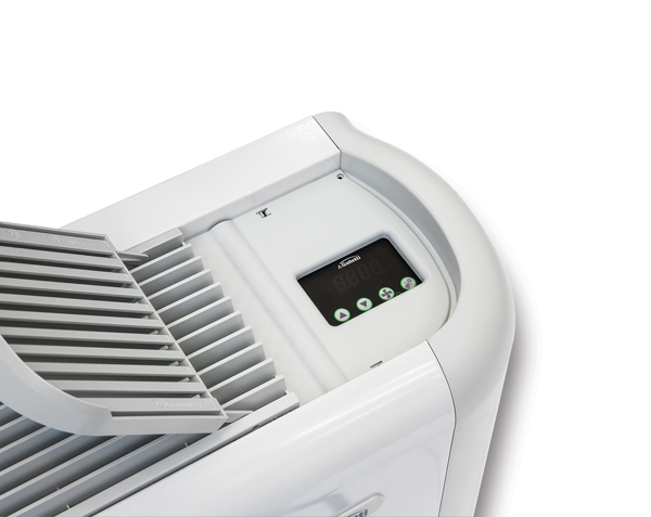- Visualizzazione della temperature aria ambiente, set-point, della velocità di ventilazione e della modalità selezionata sul display a LED.